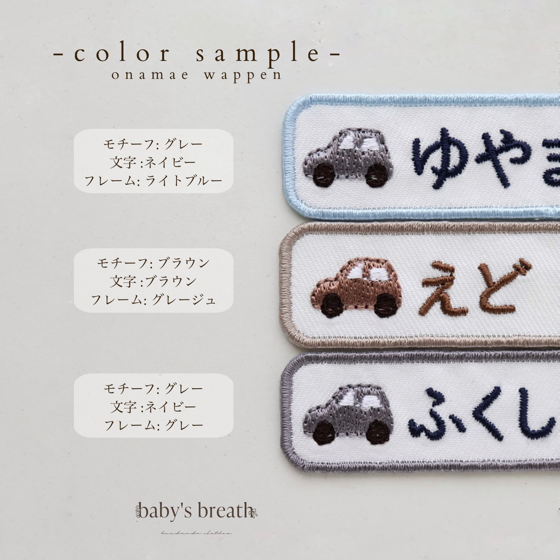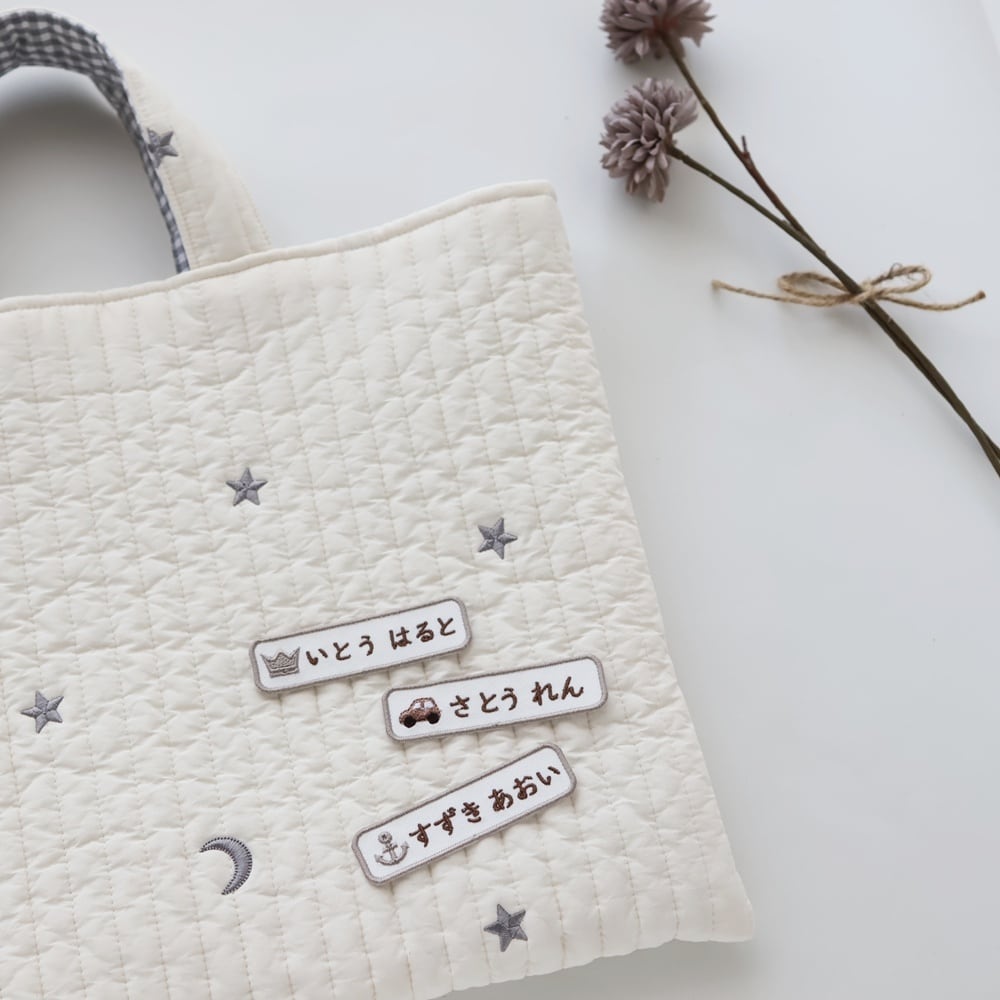 モチーフ刺繍がワンポイントになる、お名前入りの大きめワッペンです。