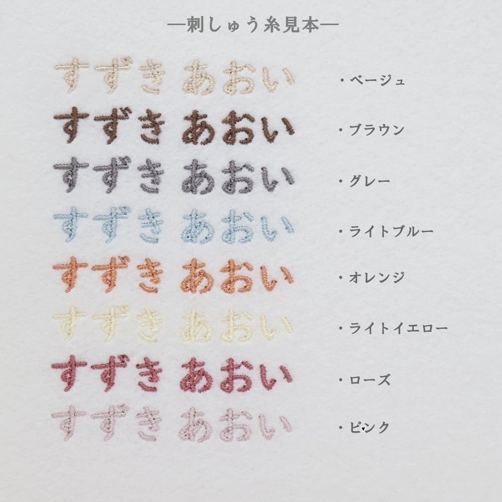 また、刺繍する文字数によっては全体のバランス調整のためサイズが変わる場合がございますのでご了承ください。